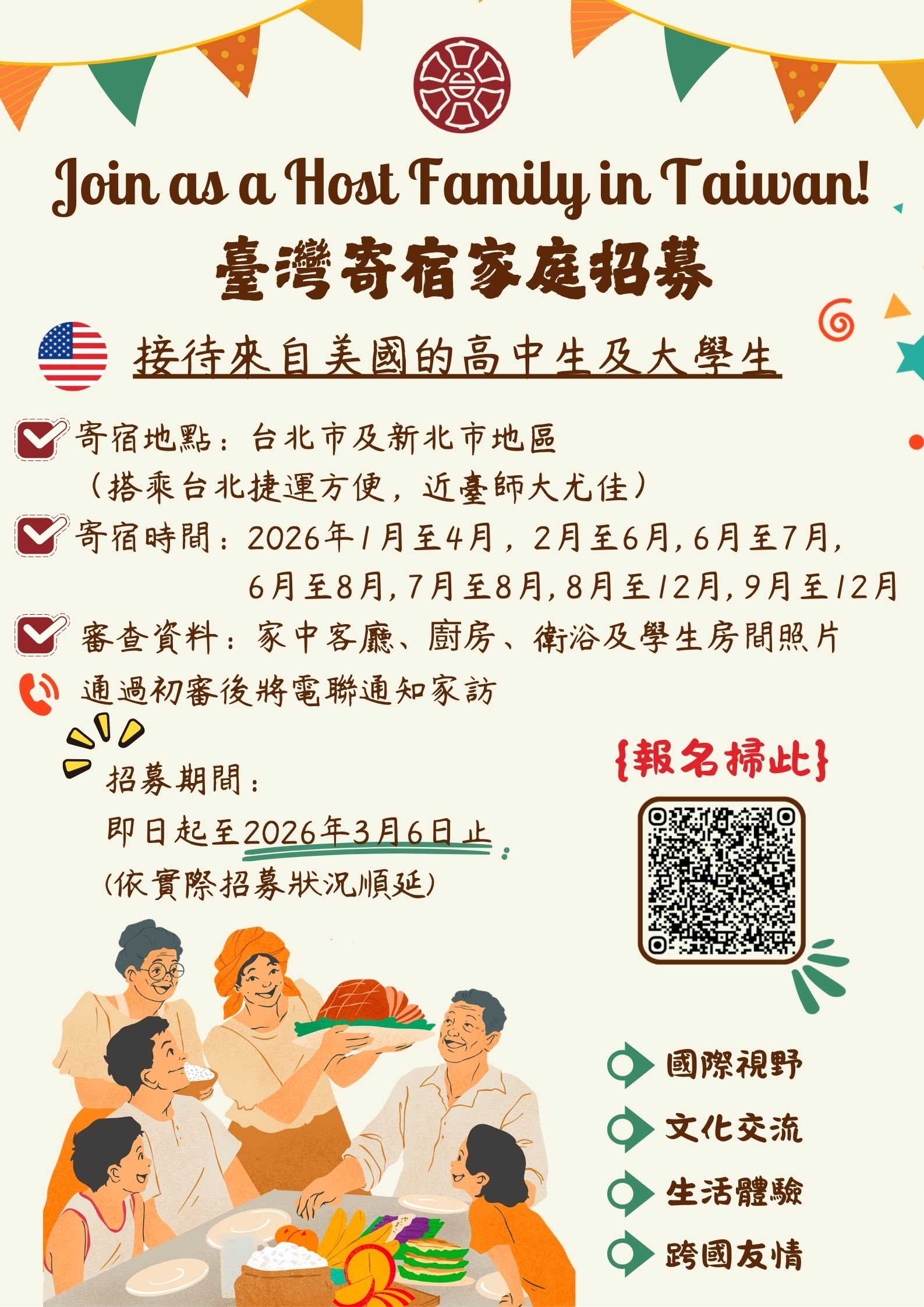 透過這個計畫,來自美國的高中生與大學生將在臺灣學習期間,融入您的家庭生活,親身體驗臺灣的日常文化。而您的家人也將有機會與他們互動建立連結,不僅能促進語言上的交流,更能了解不同國家的生活方式與文化特色。